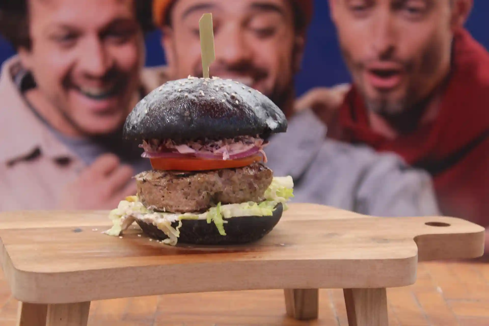 Squid ink bun's, steak, salad, tomato,…