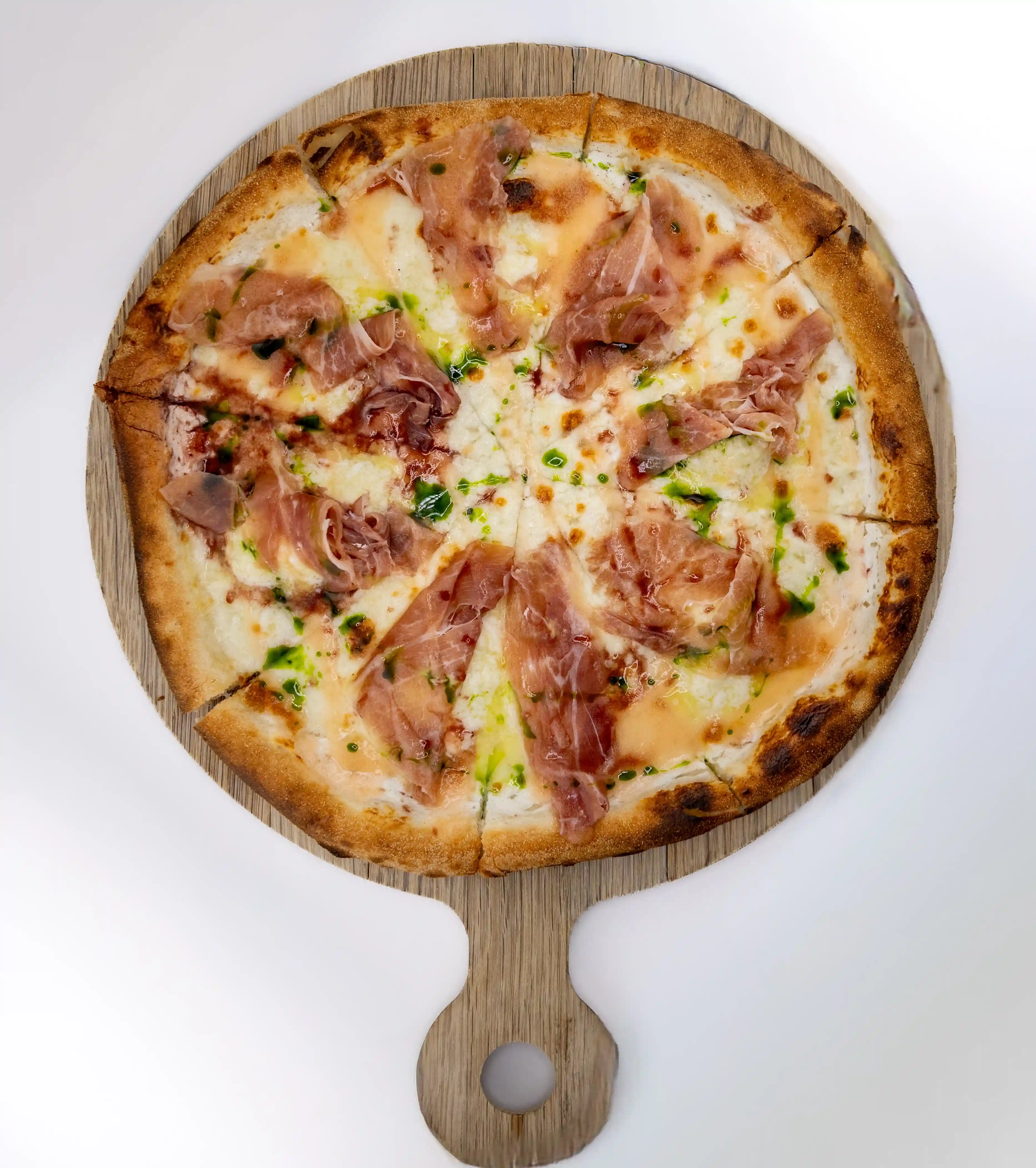 Fromage blanc, mozzarella « Fior di Latte », shawarma, poivrons, oignons, chou mariné, sauce ail