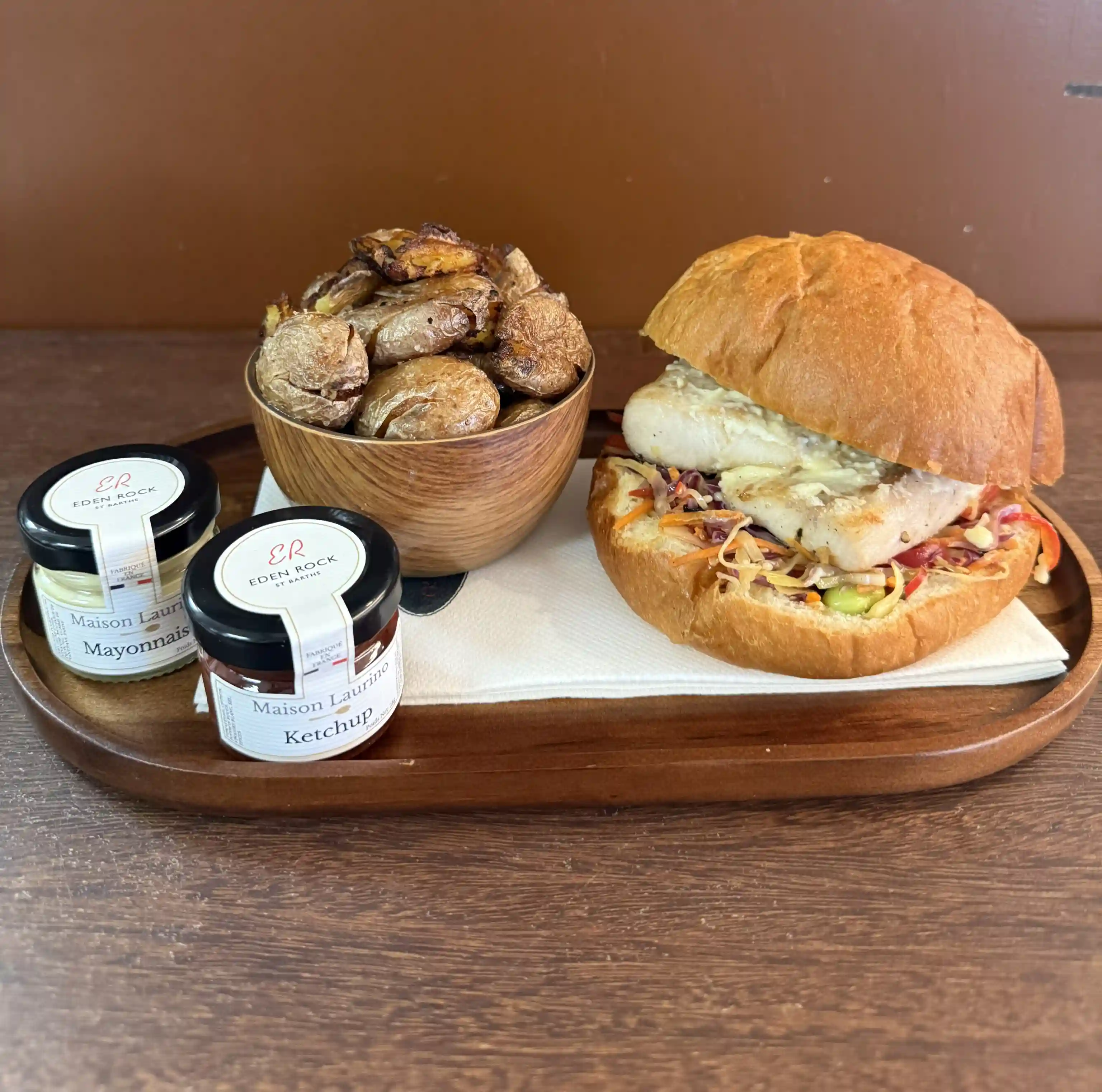 Mahi grillé, asian slaw, mayonnaise citron avec pommes de terre frappées ou salade verte
