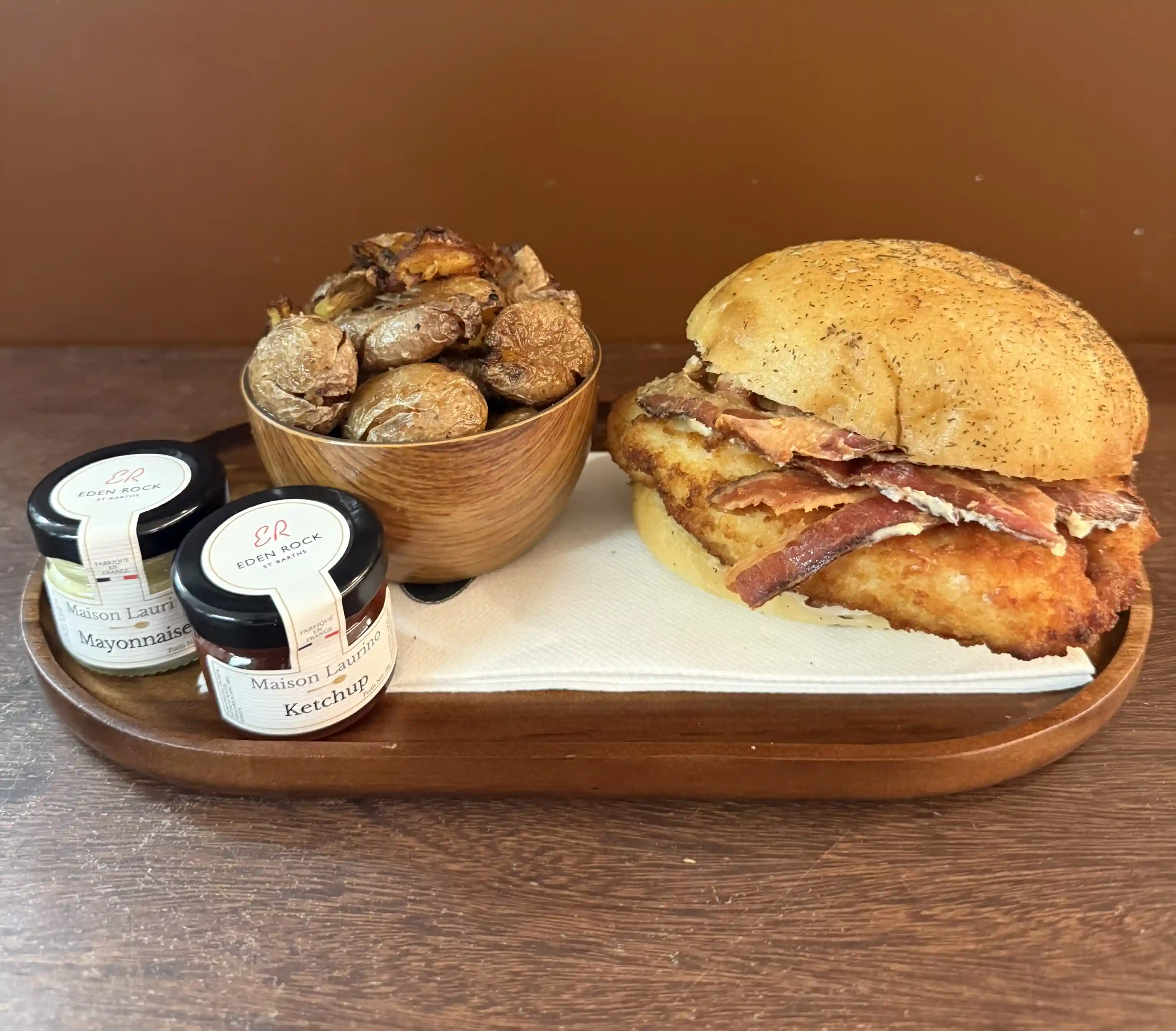 Poulet, bacon, oignon, mayonnaise moutarde à l'ancienne avec pommes de terre frappées ou salade verte