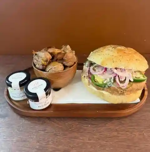 Effiloché de porc , mayonnaise relish, pickles concombre, piment, oignon rouge, jalapenos avec pommes de terre frappées…