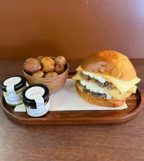 Steak, fromage à raclette, oignon confi…