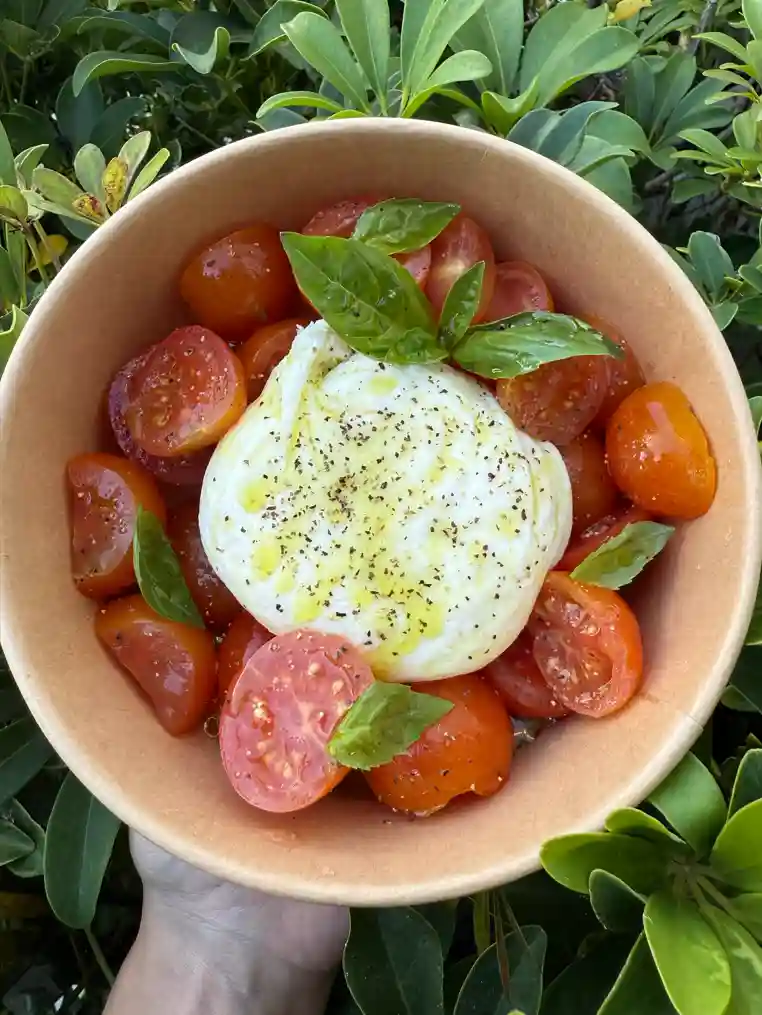 Burrata de 125g, tomate cerise, huile de basilic maison